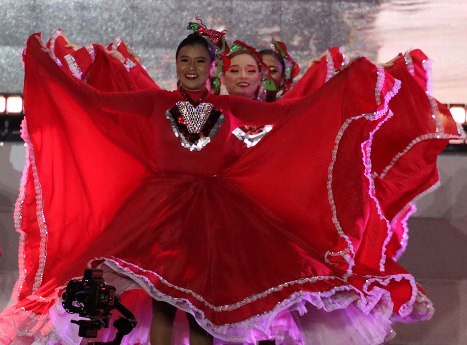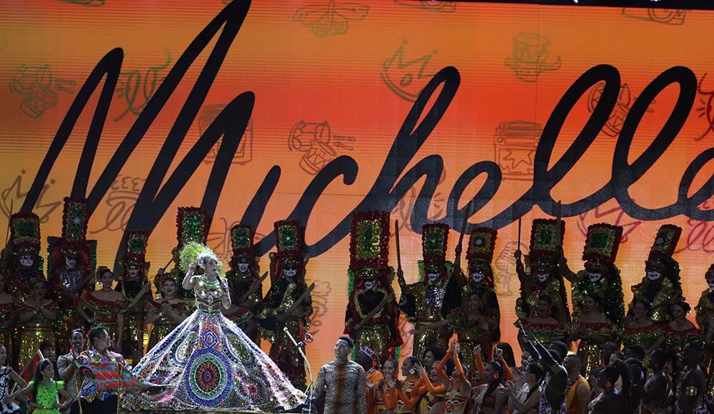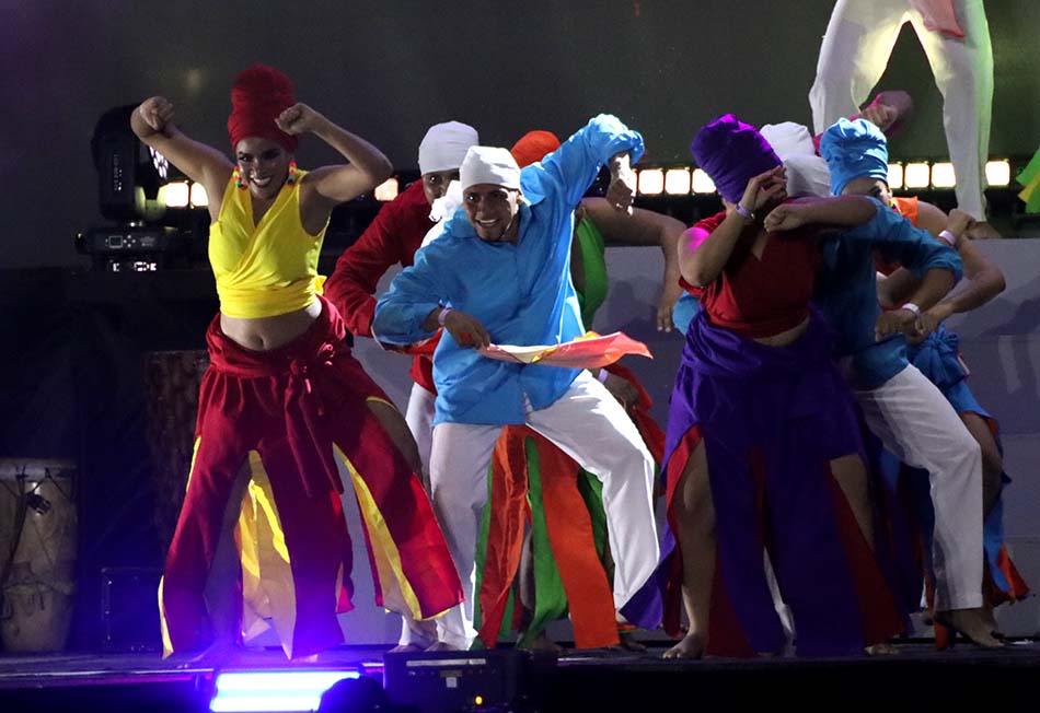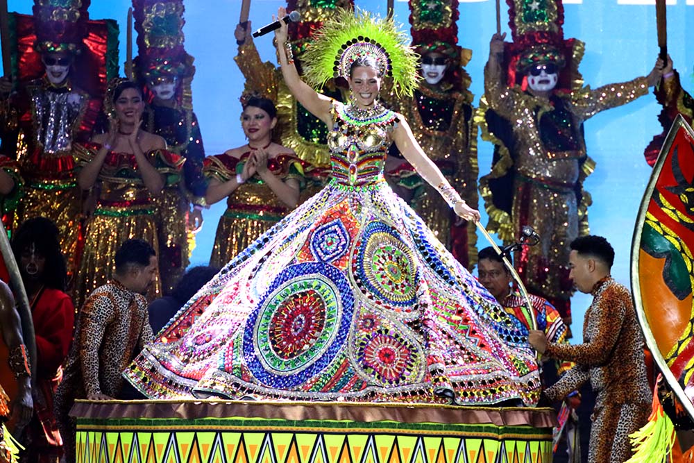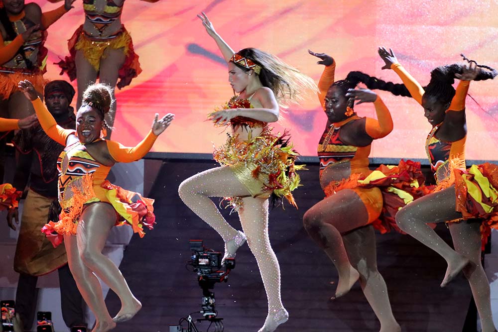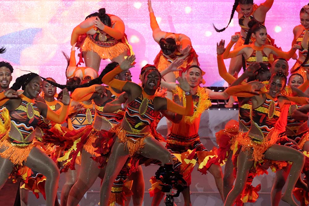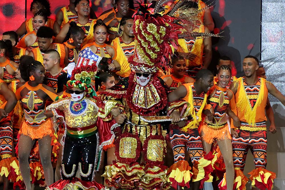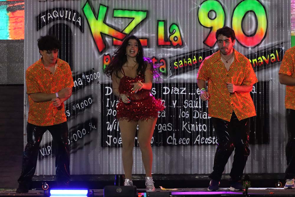 Fueron 700 los artistas que participaron en el espectáculo dirigido por el maestro Pedro Díaz, que llevó por nombre ‘Raíz negra’ y que resaltó el legado y la tradición que dio origen a muchos de los bailes y danzas propias del carnaval. La reina, que participó activamente en la mayoría de los hitos del evento contaba solamente con un minuto 40 para los cambios de vestuarios y poder salir al escenario a comandar cada uno de los bailes lo que sirvió para demostrar sus cualidades y capacidad artística y dancística.